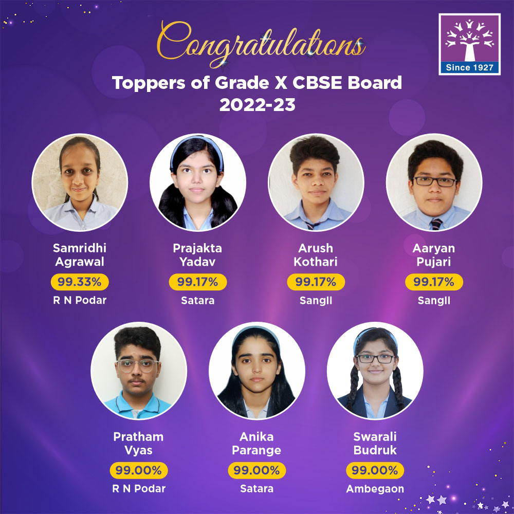 Podar International Schools takes immense pride in recognizing the exceptional achievements of its 10th CBSE toppers. Year after year, these brilliant students consistently demonstrate their dedication, hard work, and unwavering commitment to academic excellence. Their remarkable accomplishments serve as an inspiration to their peers and a testament to the school's unwavering pursuit of educational excellence. These top scorers not only excel academically but also exhibit remarkable leadership qualities, strong character, and a genuine passion for learning.